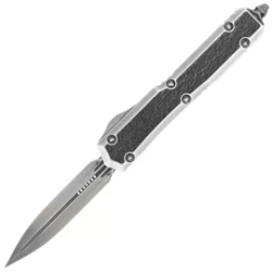 Makora D/E Signature Silver Distressed Aluminum/Leather, Black Stonewashed is a full-size OTF automatic knife. Operating in D/A mode, it features a hell of a fast blade extension mechanism. Designed by Tony Marfione owner of Microtech Knives