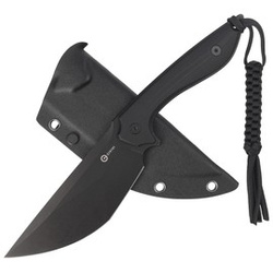 Concept 22 Black G10, Black Stonewashed, a sturdy EDC knife with a fixed blade design by Tuffknives. Utilitarian blade shape made of N690 steel, G10 handle. Kydex sheath, equipped with a T-Clip to allow attachment to the belt, decorative paracord pendant.