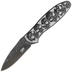 Skulls Stainless Steel, Titanium Coated, a compact folding knife from the renowned CJH Herbertz , featuring a skulls motif on the Handle and blade. Blade of drop point type made of 420 steel, ensures that the knife will do any job you put in front of it