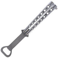 Bottle opener by Herbertz CJH. The lever of the opener made of 420 stainless steel. Folding arms identical to those of butterfly knives. Notch type locking mechanism allows the handle arms to be locked in open or closed position.