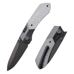 Aurora Gray Titanium/Carbon Fiber, Manual Fine Grinding Satin/Pearlescent, elegant folding knife with titanium Handle and carbon fiber inlays. Blade made of M390 steel finished by hand, axis lock, ceramic bearings.
