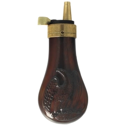 DP535-31 powder flask with dispenser by Davide Pedersoli. Designed for black powder firearms in .31 cal. Powder charge 9 grains. Made of lacquered copper with a brass dispenser. Adorned with relief of an eagle clutching black powder revolver in its talons