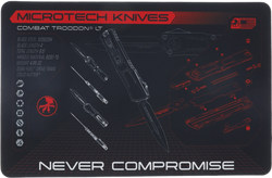 Combat Troodon Black Display Mat – profesjonalna mata prezentacyjna z grafiką modelu Combat Troodon, wykonana z trwałego tworzywa PVC, odporna na zabrudzenia i idealna do prac serwisowych z nożami.