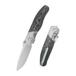 Velvet Snake Grey Titanium/Watermelon Sugar Camo Carbon, Stonewashed kompaktowy folder EDC ze studia Bastards Knives. Głownia z doskonałej stali Böhler M390, rękojeść z tytanu i włókna węglowego. Pewna i bezpieczna blokada liner lock.
