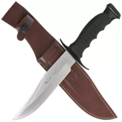 95-181 Black Rubber, Satin duży nóż survivalowy ze stali nierdzewnej 420H. Okładziny rękojeści z elastycznego moletowanego elastomeru gwarantują wygodny i pewny chwyt. Ręcznie szyta skórzana pochwa. Tradycja i nowoczesność w jednym narzędziu!