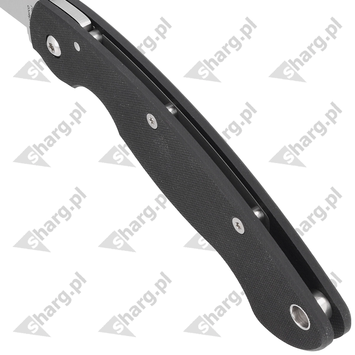 Handle - profiled, covered with lightweight, non-slip textured liners made of durable, temperature- and chemical-resistant G-10 plastic (fiberglass compressed with synthetic resin). Right-side metal clip for carrying the knife in tip-down (tip-down) position. In the back of the handle lanyard hole, a hole for pulling a lanyard.