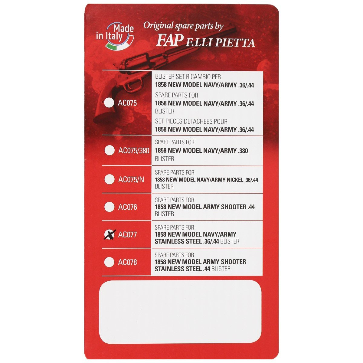 - AC077 (service), set of necessary consumables for Pietta Arms 1858 Remington New Model Navy / Army Stainless Steel .36 / .44 inch percussion revolvers.