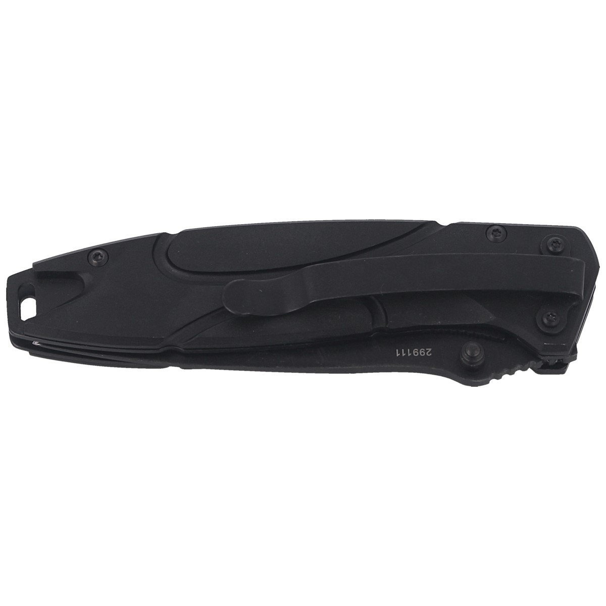 Blade - with a Drop Point profile, 2.9 mm thick, made of AISI 420 stainless steel, hardened in the range of 54-57 HRC, is characterized by high corrosion resistance. Matte black coating gives a tactical look and eliminates glare. The partially serrated Combo blade is made with a Flat Grind cut. The double-sided Thumb Stud allows you to open the knife with one hand. The blade has a Liner-Lock type lock.