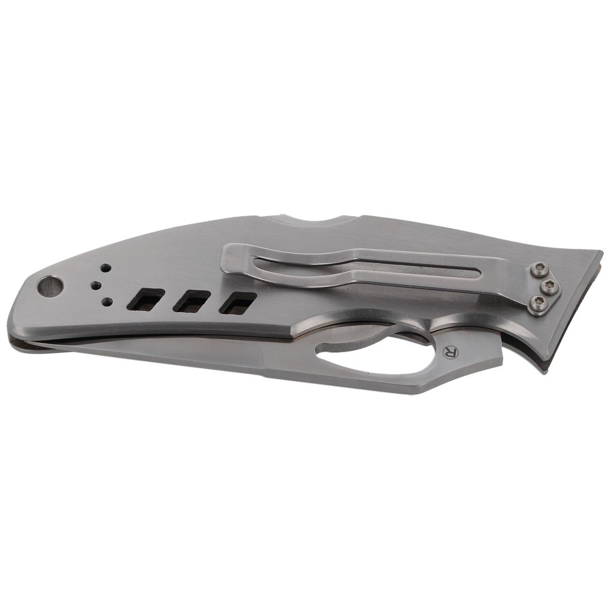 Handle - solid claddings are made of Stainless Steel. Ergonomic shape provides comfortable and secure grip also with gloves. The holes in the covers allow air to dry a wet, moist blade faster. The pocket knife is equipped with a right-hand metal clip with the possibility of fixing in two planes (Right Tip-up / Tip-down). At the back part of the handle was placed a gap (lanyard hole) enables the attachment of a security rope.