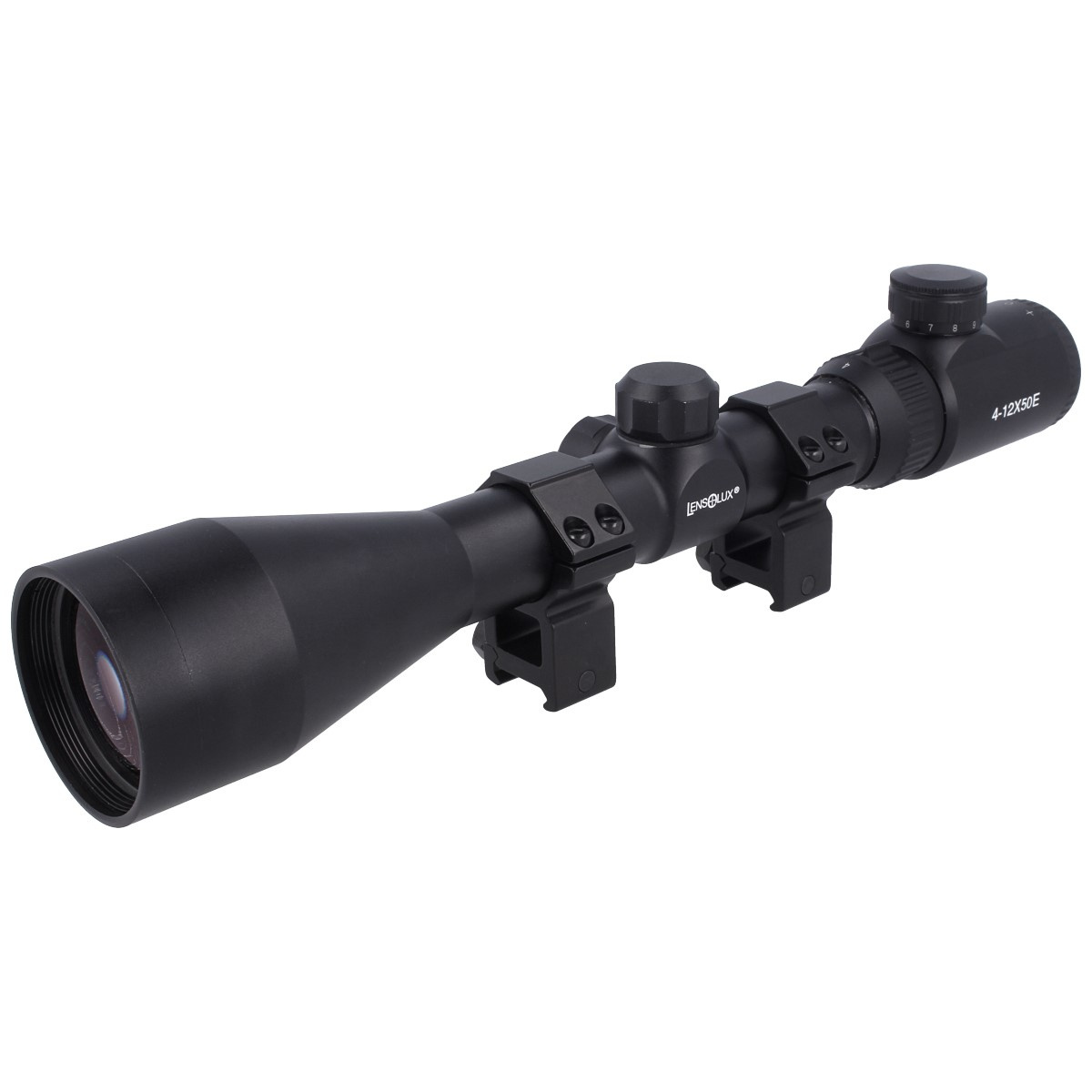 • 19435 a new generation rifle scope with illuminated 4 Red-Dot crosshair by Lensolux. Variable magnification 3-12x, lens diameter 50mm. Viewfinder with excellent twilight performance and for aiming at smaller targets at longer distances