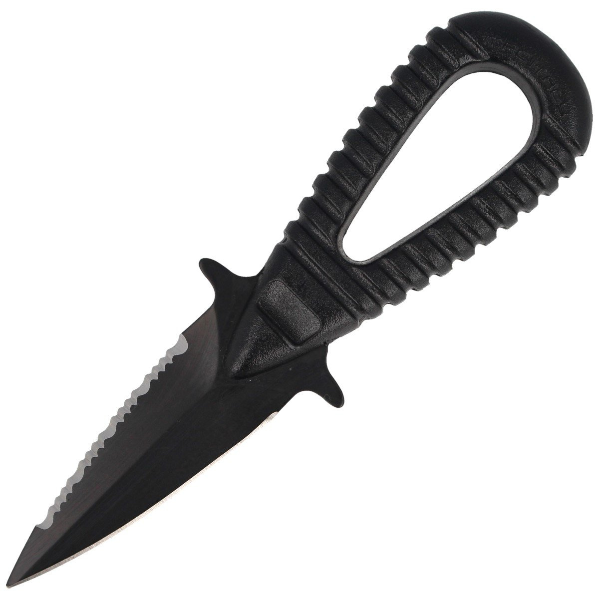 Blade - with a Dagger (dagger) profile, double-sided with excellent cutting properties brought out with a Flat Grind. One of the blades fully smooth Plain, the other serrated Serrated ending on the side of the tip with a several-millimeter smooth blade. Serrated (serrated) blade used in diving, rescue and survival knives. The unique blade consists of alternating one large and three small teeth, the so-called three-step. This pattern increases the length of the cutting edge by up to 24% compared to a straight blade. It is ideal for aggressive cutting of hard materials, plastics and fibrous materials such as ropes and nets. The blade is coated with a scratch-resistant non-reflective IDROGLIDER GOLD® Black coating.