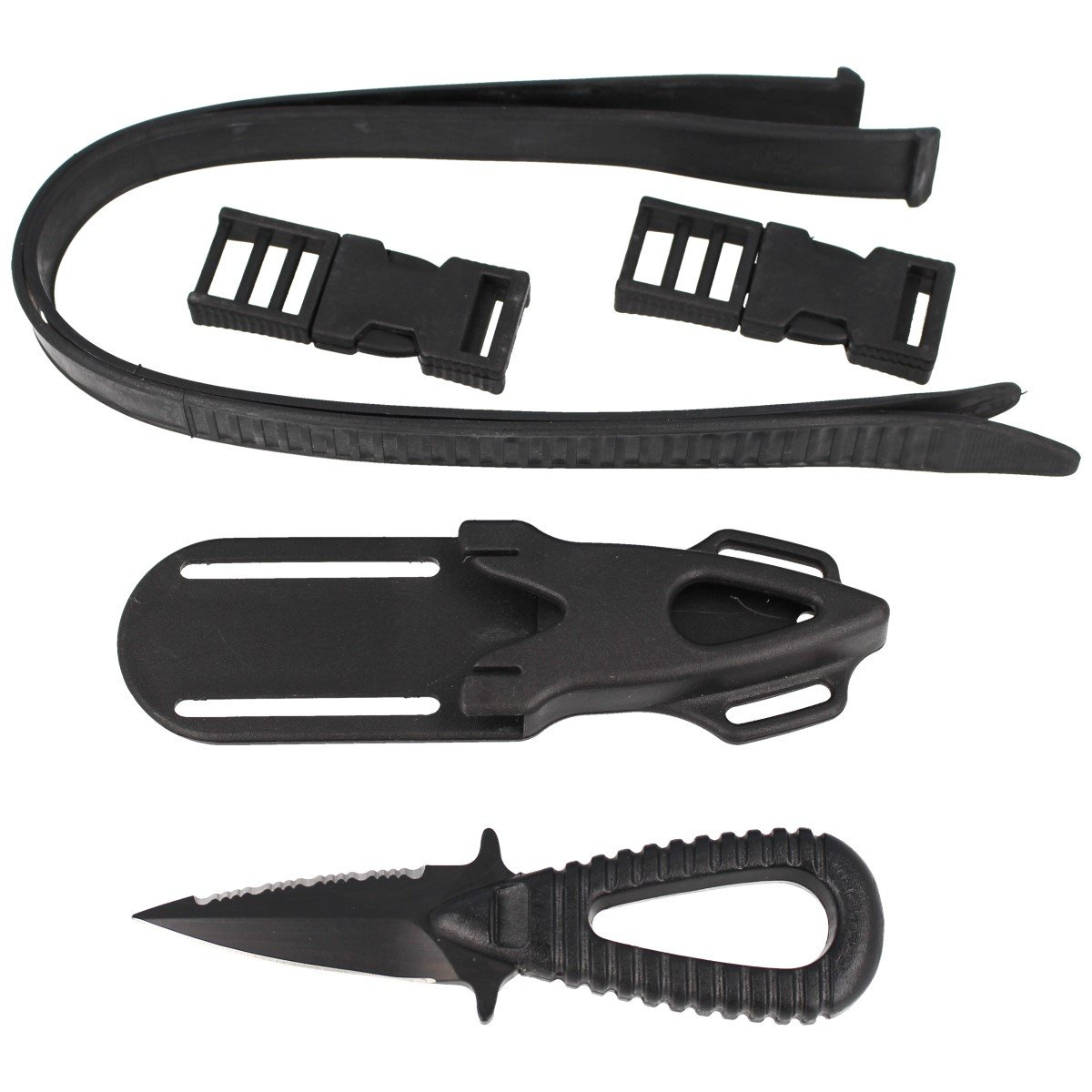 Sheath - made of hard PP polymer with holes for drainage of water, moisture. The holster is equipped with a latch to prevent the knife from slipping out in water. The sheath comes with two rubber straps and 2 plastic buckles for attaching the case to the hand, leg or to a vest.