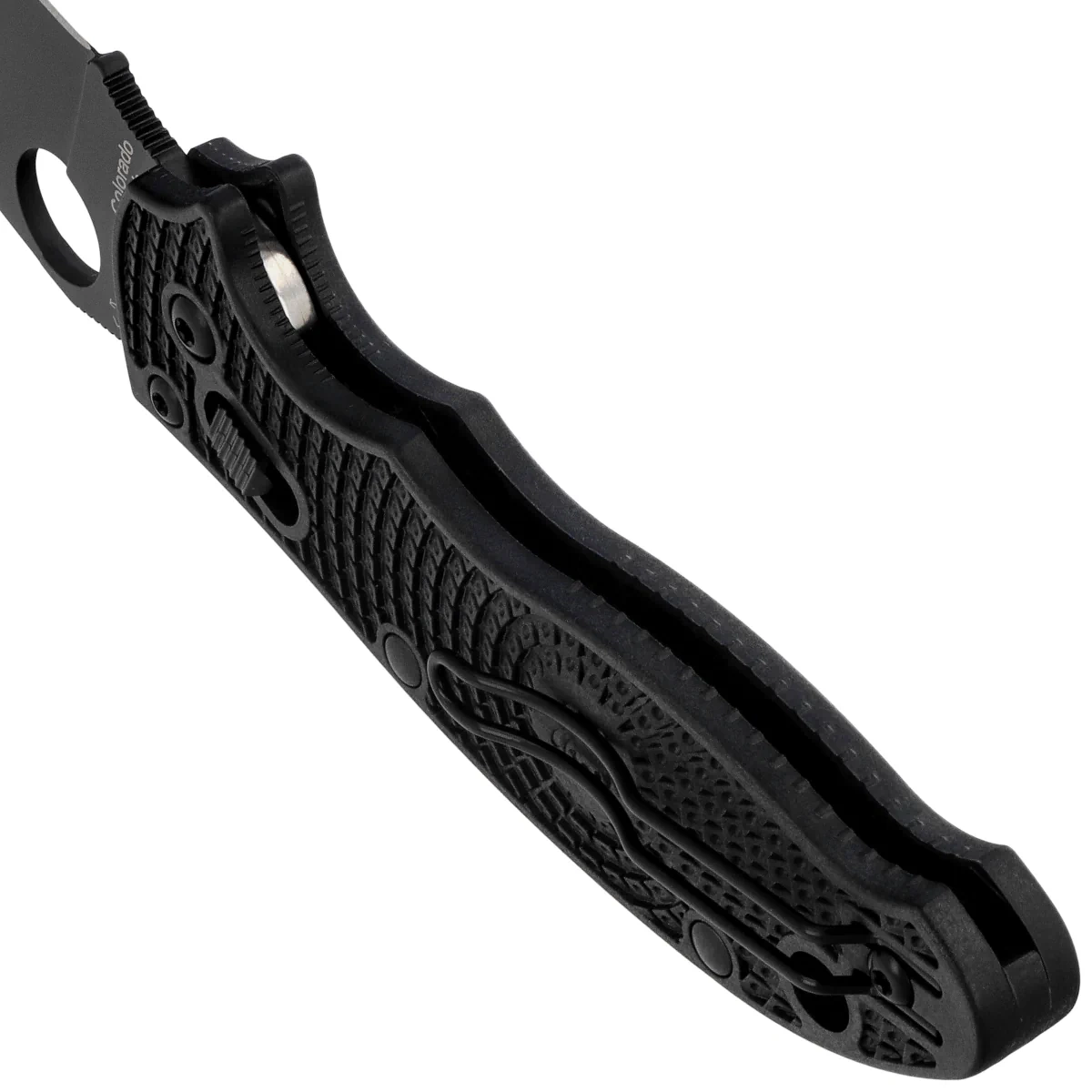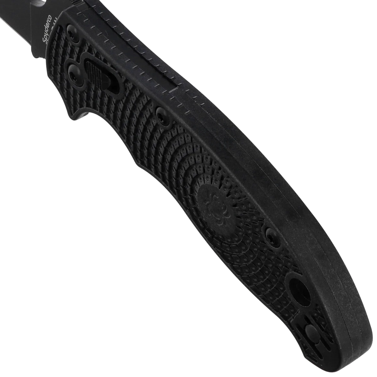 Blade - with Leaf-Shaped profile, thickness 3.2 mm. Covered with a scratch-resistant matte non-reflective DLC (Diamond Like Coating) coating in black color. Smooth blade (Plain type) was made with a full flat cut (Full Flat Grind). The flat cut provides excellent cutting edge geometry with a sharp tip and reduces the weight of the knife. An enlarged 14 mm round SpyderHole cut-out (Spyderco patent) makes it easier to open the knife in the glove. The notched thumb ramp and the Finger Choil undercutting the index finger between the handle and the cutting edge increase the control of the knife.