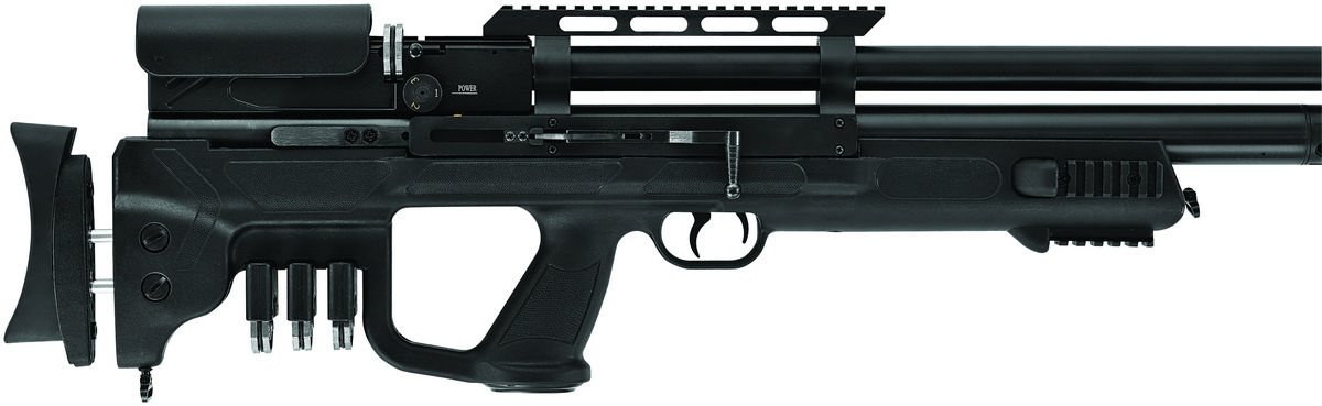 • Gladius Long powerful Hatsan bullpup PCP air rifle with 6-stage adjustment of the shotgun's discharge energy knob depending on the distance needed. By using a flaskless system, compact dimensions were achieved while maintaining the normal barrel length.