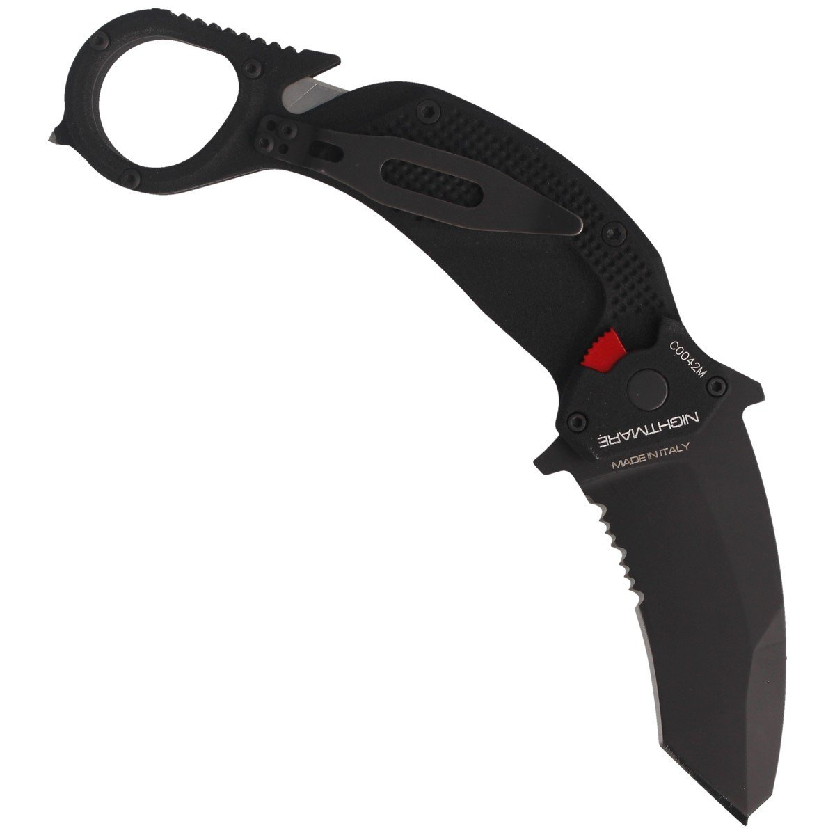 • NightMare Black, advanced karambit and rescue knife in one. Double-sided after folding the blade works like a Flipper or Emerson hook, serving to quickly open the blade in 2 ways.