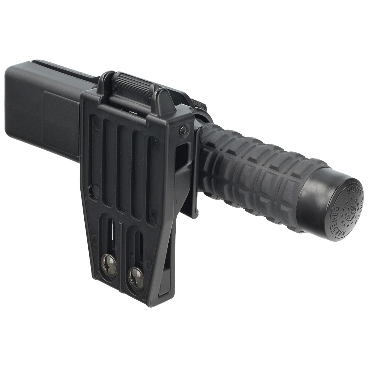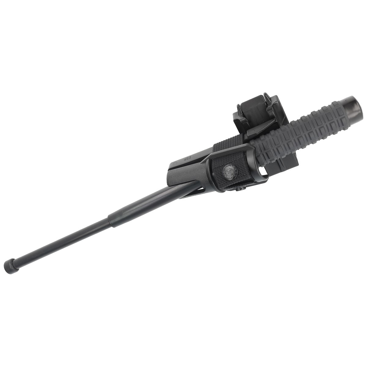 BH-54 - professional, rotating holder for baton. Equipped with a belt mount UBC-05 with a Quick Change System for fast detachment. Designed for Friction Loc batons in lengths of 16", 18", and 21" (does not fit ESP Compact batons). It allows for carrying the baton in both folded and extended positions, vertically, horizontally, or at any angle. The patented design allows the holder to rotate 360° in one of 16 defined positions. The force required to rotate the holder can be adjusted by tightening the screw according to your needs. The ability to adjust the angle of the holder increases carrying comfort and allows for quick access in emergency situations.