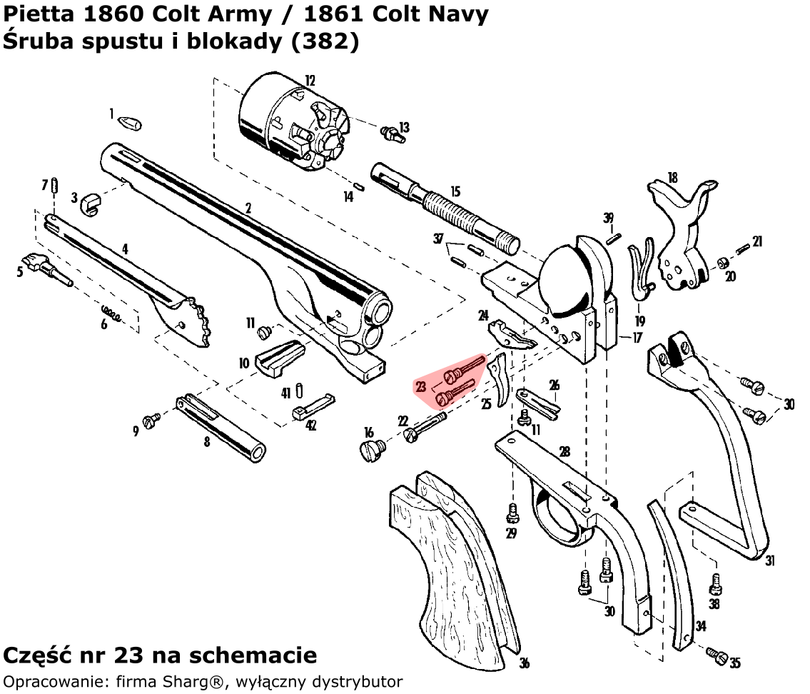 • 382 (service) Pietta trigger and lock screw. For 1851 Colt Reb Nord Navy and 1860 Colt Army / 1861 Colt Navy Black Powder Revolvers.