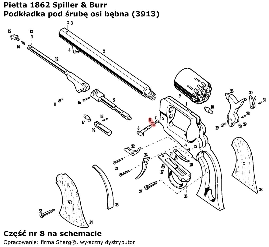 • 3913 (service) a metal washer for the Pietta drum axle mounting bolt. For 1862 Spiller & Burr Black Powder Revolver .36 cal.