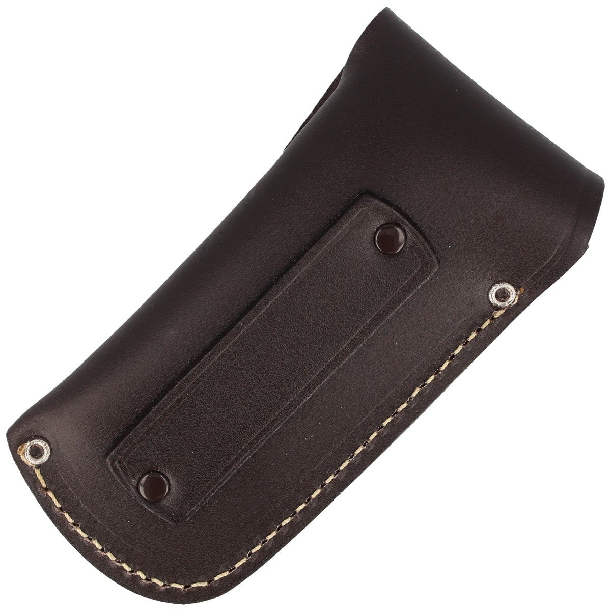 A solid case made of natural cowhide in dark brown color with an embossed manufacturer's logo. The sheath was sewn at the edges with a decorative thread. Fastening to a belt or attachment allows the knife to be moved in an vertical position.