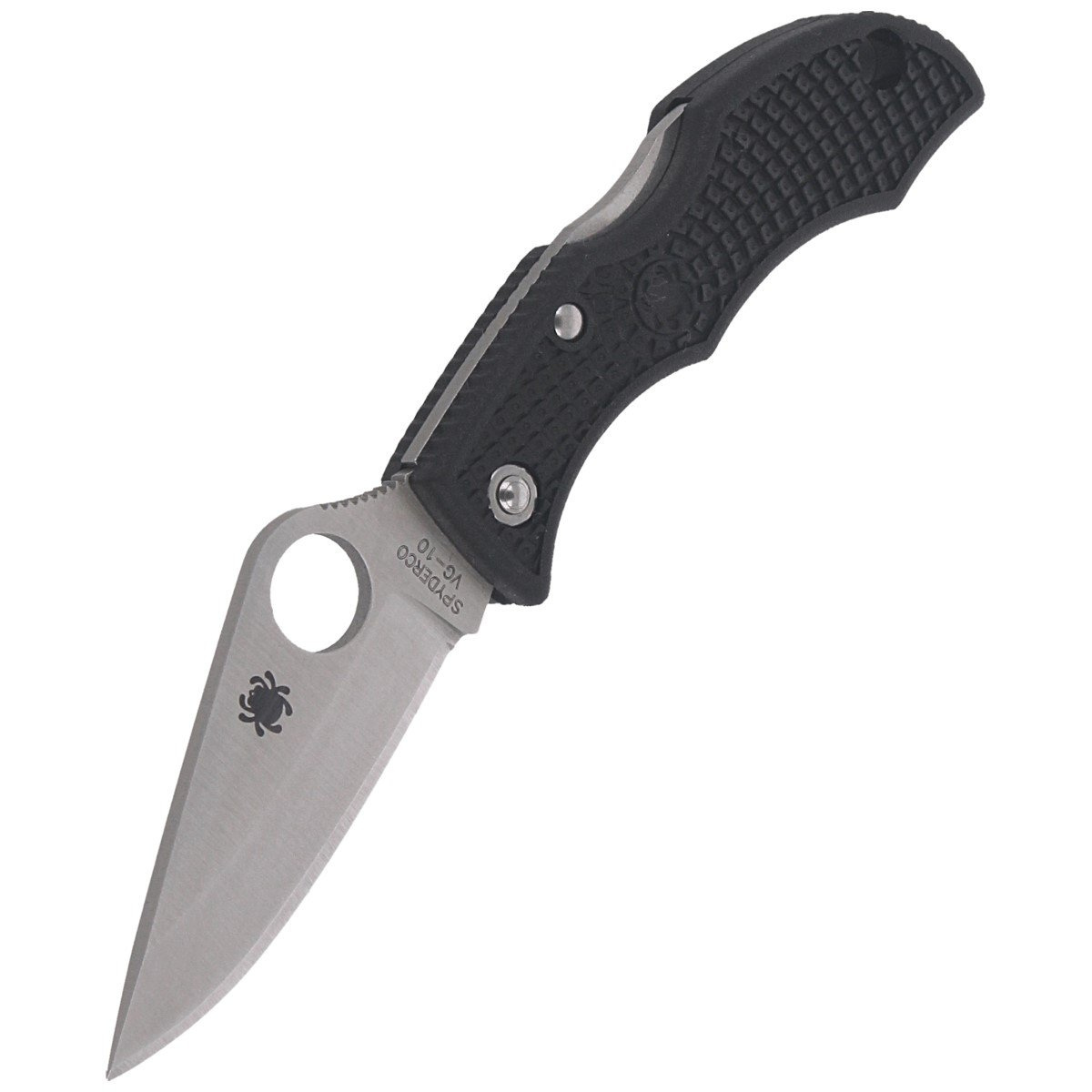 Head - with a modified profile Clip Point, thickness 2 mm, made of Japanese stainless steel VG-10 (easy to sharpen, holds sharpness well). Blade hardened in the range 59-61 HRC. Coating Satin Finish (semi-mat) eliminates glare. Plain blade Plain was derived by grinding flat (Saber Grind). Round cutout SpyderHole (Spyderco patent) allows you to open the knife with your thumb. Solid Back-Lock notched Boye Detent, preventing accidental release of the lock when the knife is firmly gripped. Notched ramp under the thumb.