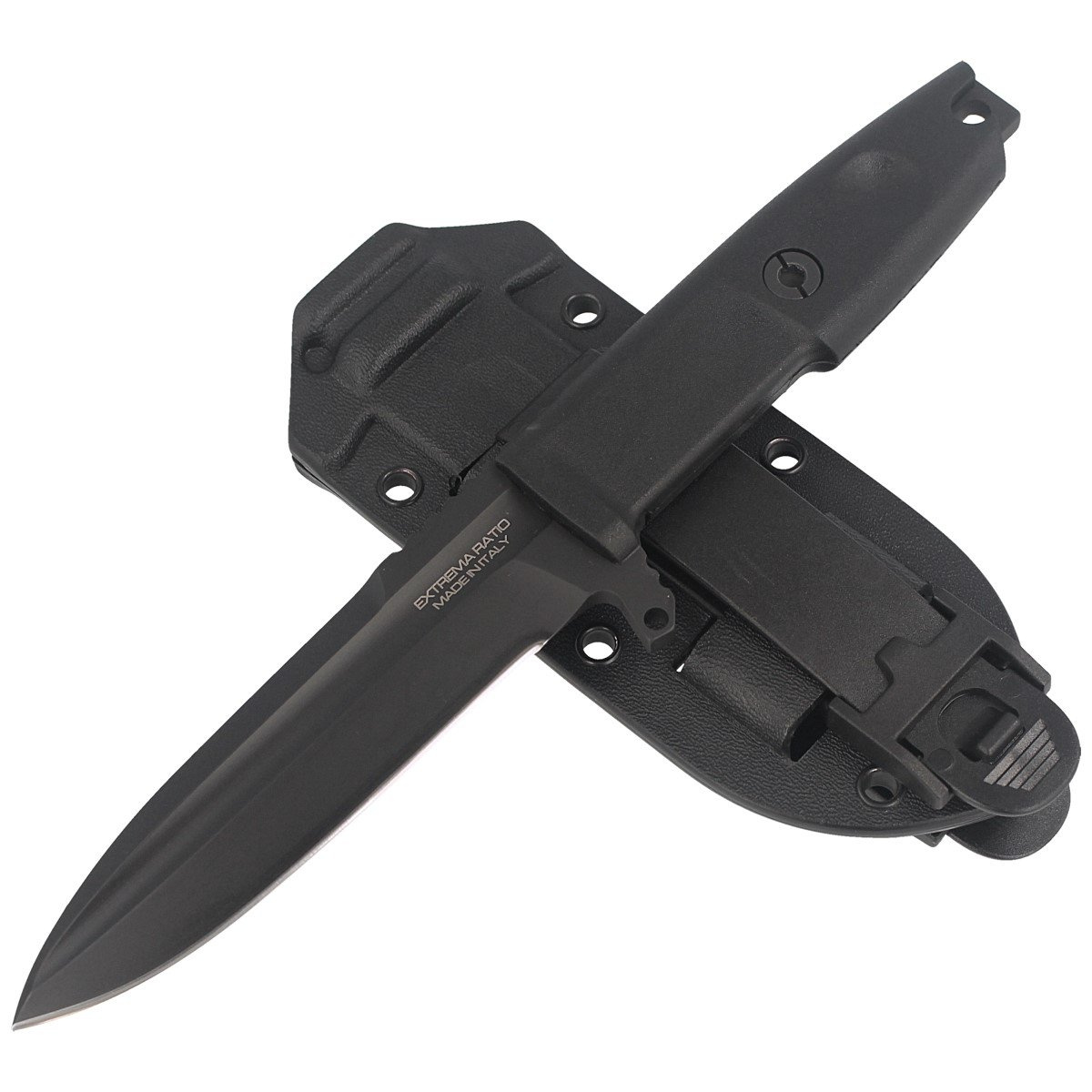 Scabbard - lightweight, made of Kydex material in black. Universal openwork, the holster protects the knife from falling out and facilitates drying the head. On both sides of the holster, a system of straps made of flexible polymer allowing quick attachment of the scabbard under the straps of the M.O.L.L.E. system. (Modular Lightweight Load-carrying Equipment) or on the belt.