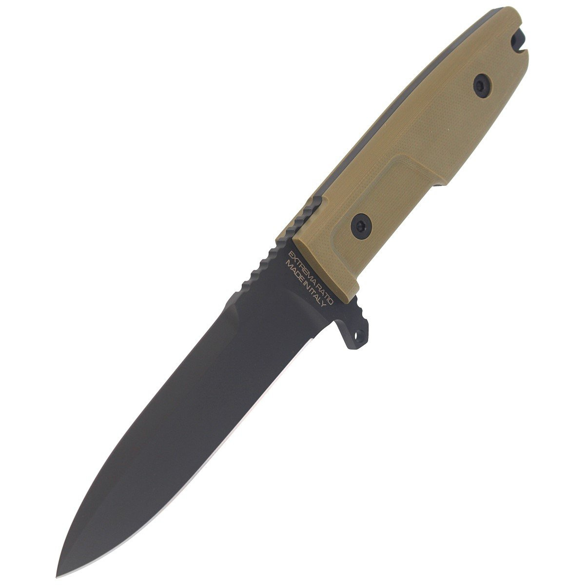 Blade - profile is of the modified spearpoint type, with a false counter-thread ¾ in length on the back and a lower guard to protect the hand during use. Both the guard and the knob have holes to facilitate the fastening of the knife to various tools or for the passage of laces. Blade has a surface coating in DLC (Diamond-Like Carbon) Carbon-based making it hyper-resistant to abrasion and chemical aggression. Given the burdensome use of the tool, for the grip the more powerful high-resistance G10 has been used, instead of the usual Forprene. It is fixed to the FULL TANG profile by two passing screws and maintains all the known ergonomic features of the Extrema Ratio handles.