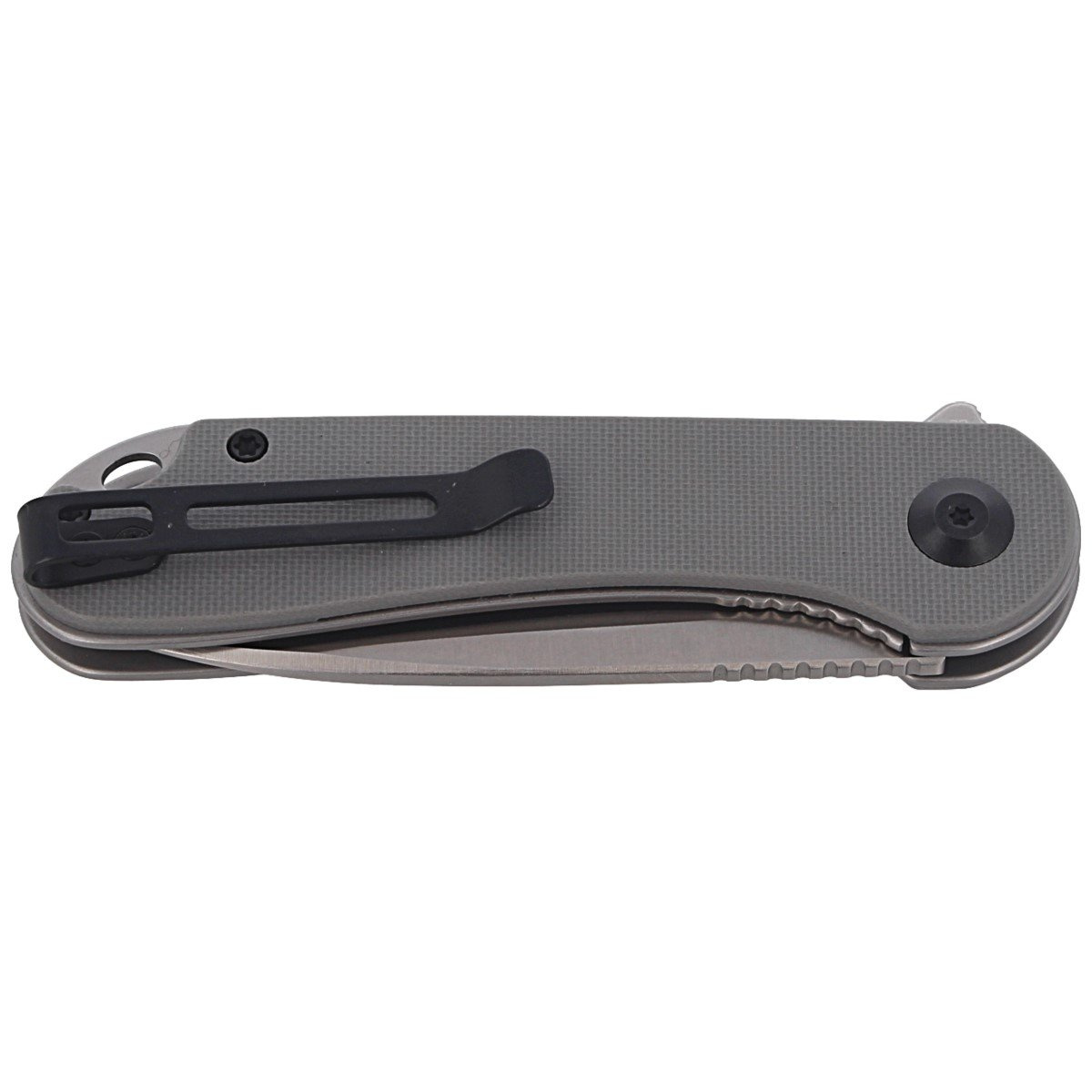 Handle - light gray, fashionable G10, textured for better grip. The whole is mounted to steel liners. In practice this means many years of work without weakening the construction. Open-backed construction without typical backspacer, fixed to each other with steel spacers facilitates cleaning in the field. The pivot is decorated with a stylized Civivi brand logo. The right-side metal deep carry clip allows you to carry the knife discreetly in your pocket in the tip-up (blade up) position. Above the clip is a lanyard hole, an oval hole for a cord.