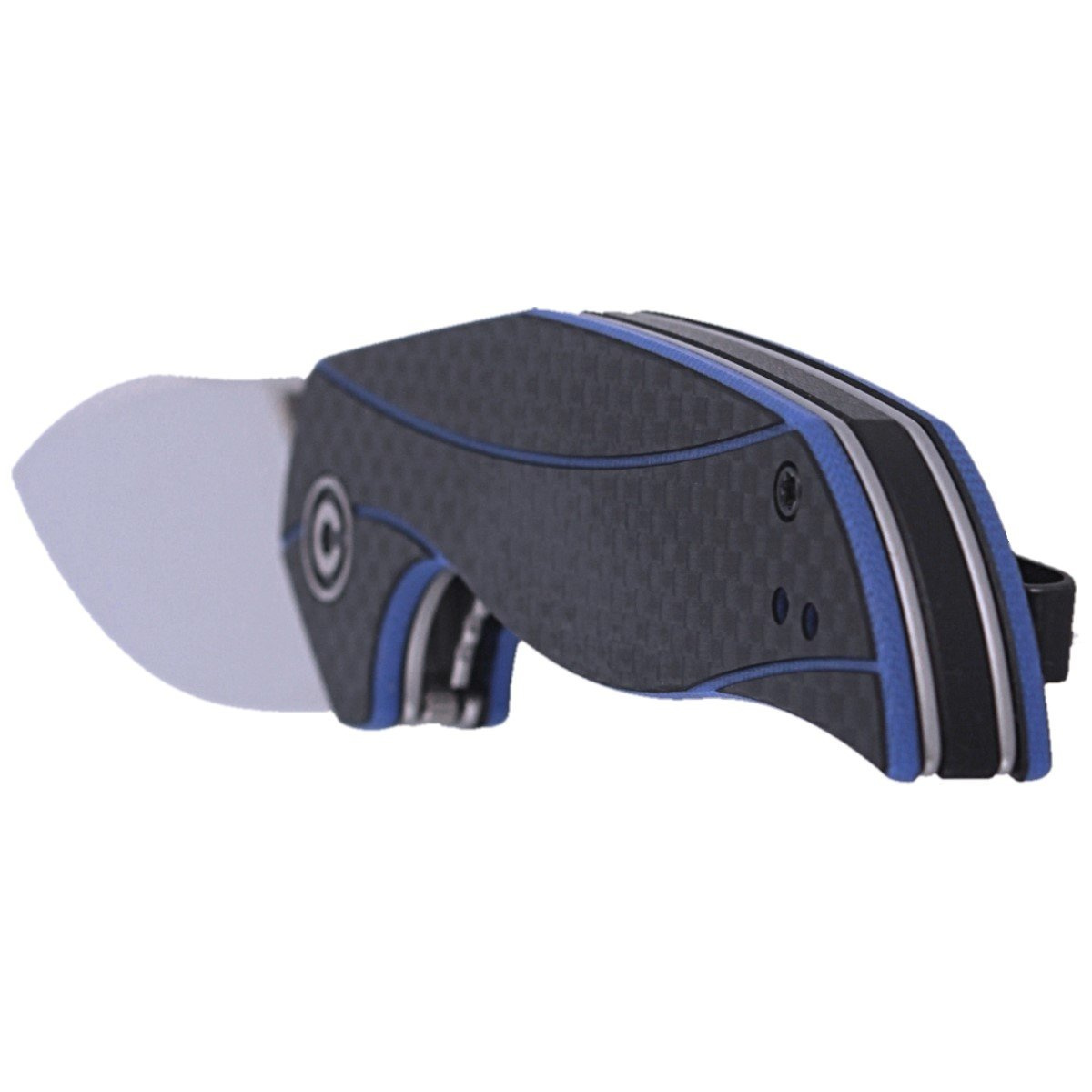 Handle - chamfered grips of blue G10 and black Carbon Fiber. Smooth surface of the facings, but with a perceptible texture that improves grip. The whole is mounted to stainless steel liners. Simple, solid construction gives assurance of many years of use. Backspacer made of black G10. The pivot is decorated with stylized logo of Civivi brand. One-position deep right-handed metal deep carry clip allows you to carry the knife discreetly in your pocket in tip-up position.