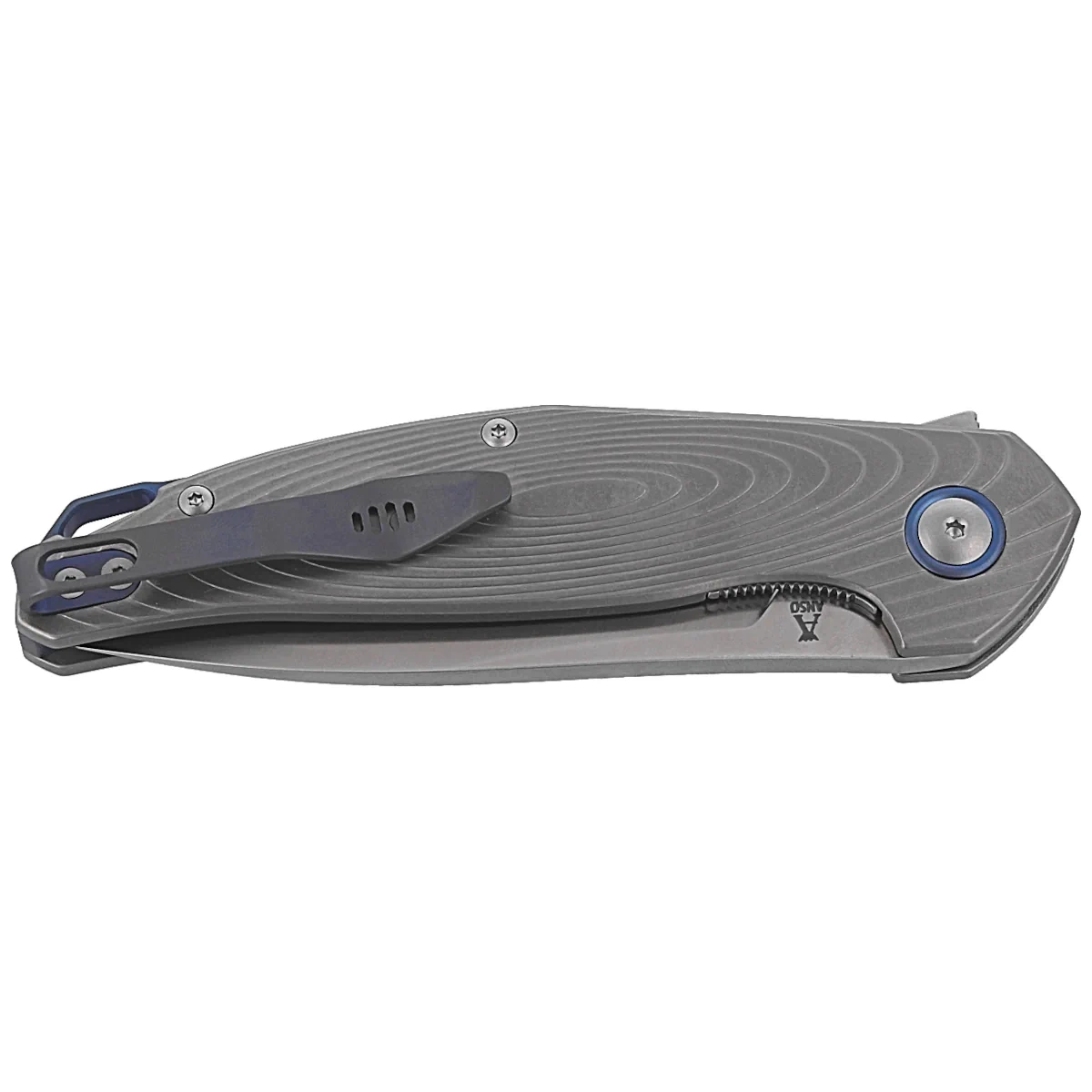 Handle - two plates of titanium gr. 5, Ti6AI4V, finished with the use of "bead blasted" method, perfectly milled on 3D numerical machine in elliptical circles. Here the mastery of Jens Anso's design is revealed, the handle is perfectly ergonomic, and the elliptical circles, in addition to their aesthetic function, also play a practical role by increasing grip security. On the inside, in the milled facings there is a Liner Lock. In the back massive titanium backspacer with characteristic Jens Anso lanyard hole. Backspacer and decorative collar around the pivot in blue anodized titanium. Right-handed, one-position titanium deep carry clip allows you to carry the knife discreetly in tip-up position.