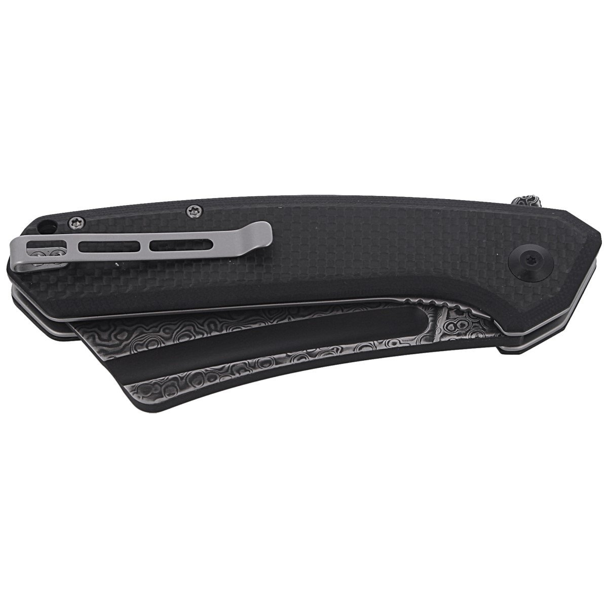 • Bullmastiff Twill Carbon Fiber / Black G10, an artful EDC knife. Flipper fin or milled indentation in the blade allows you to open the black damascus blade in 2 ways. Ceramic ball bearing is responsible for smooth operation of the mechanism. Bestseller!