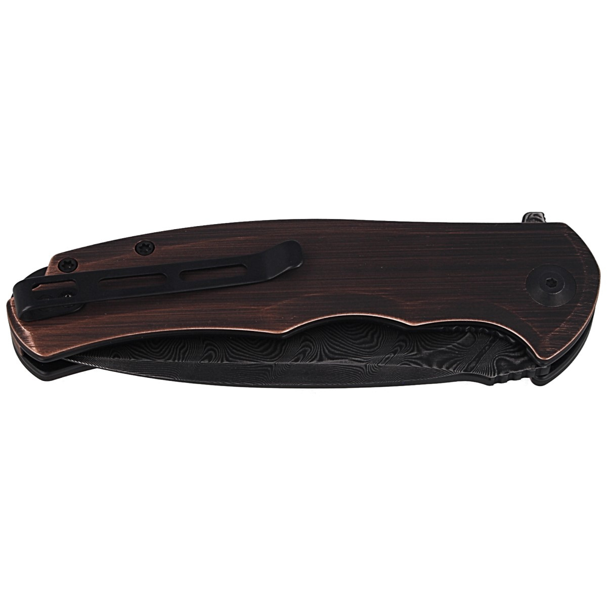 Praxis Black Copper, Black Damascus an excellent EDC with a drop point head made of damascus stainless steel. It opens with a flipper, so it can be easily used by left and right handed people. Small thickness of the blade in combination with high, concave grind gives us cutting properties almost on the level of a razor. The blade was finished with "satin" method. The blade is locked with a proven and popular liner lock.