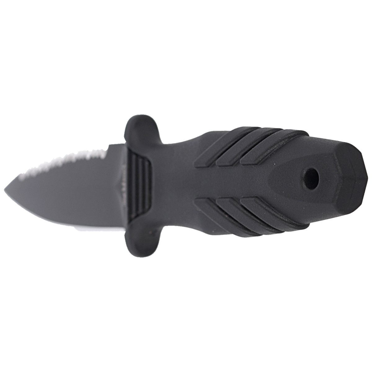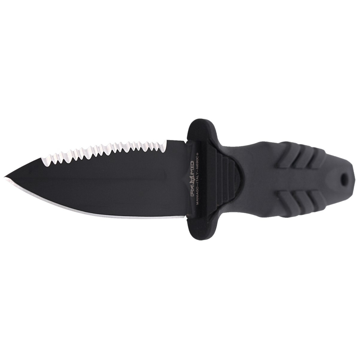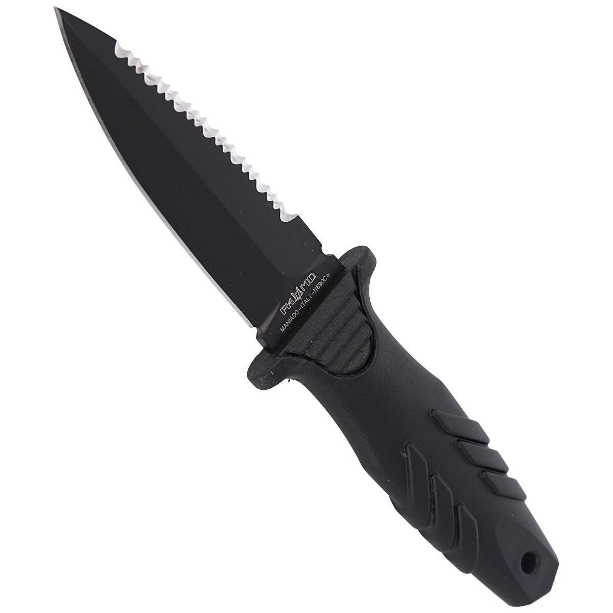 Tactical Elementum Dagger S/E Black PP/TPE, Black Idroglider P/S, designed for French combat helicopter crews. A compact dagger with a symmetrical blade, with a cutting edge on one side and a serrated edge on the back. Modern Handle made with dual-injection technology (Nylon® core covered with rubber). Sheath made of Kydex® equipped with two fasteners M.O.L.L.E. A tool ideal not only for tactical military use, but also for diving.