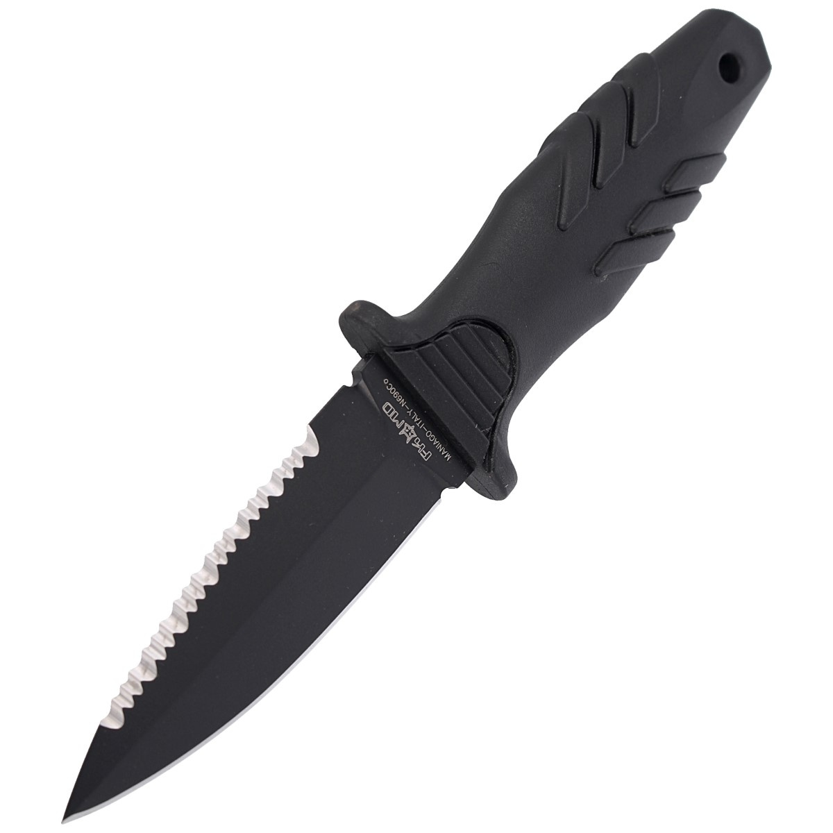 Blade - Dagger (dagger ), 3 mm thick. The blade, sharpened on one side, with sensational cutting properties, was derived with a Flat Grind. One of the edges fully smooth Plain, the other serrated Serrated (for cutting hard materials, plastics and fibrous like ropes, cords, lines). The Serrated blade (serrated) used in diving, rescue, survival knives consists of alternating one large and three small teeth, the so-called three-step. This pattern increases the length of the cutting edge by up to 24% compared to a straight blade. Ideal for aggressive cutting of hard materials, plastics and fibrous materials such as ropes and nets.