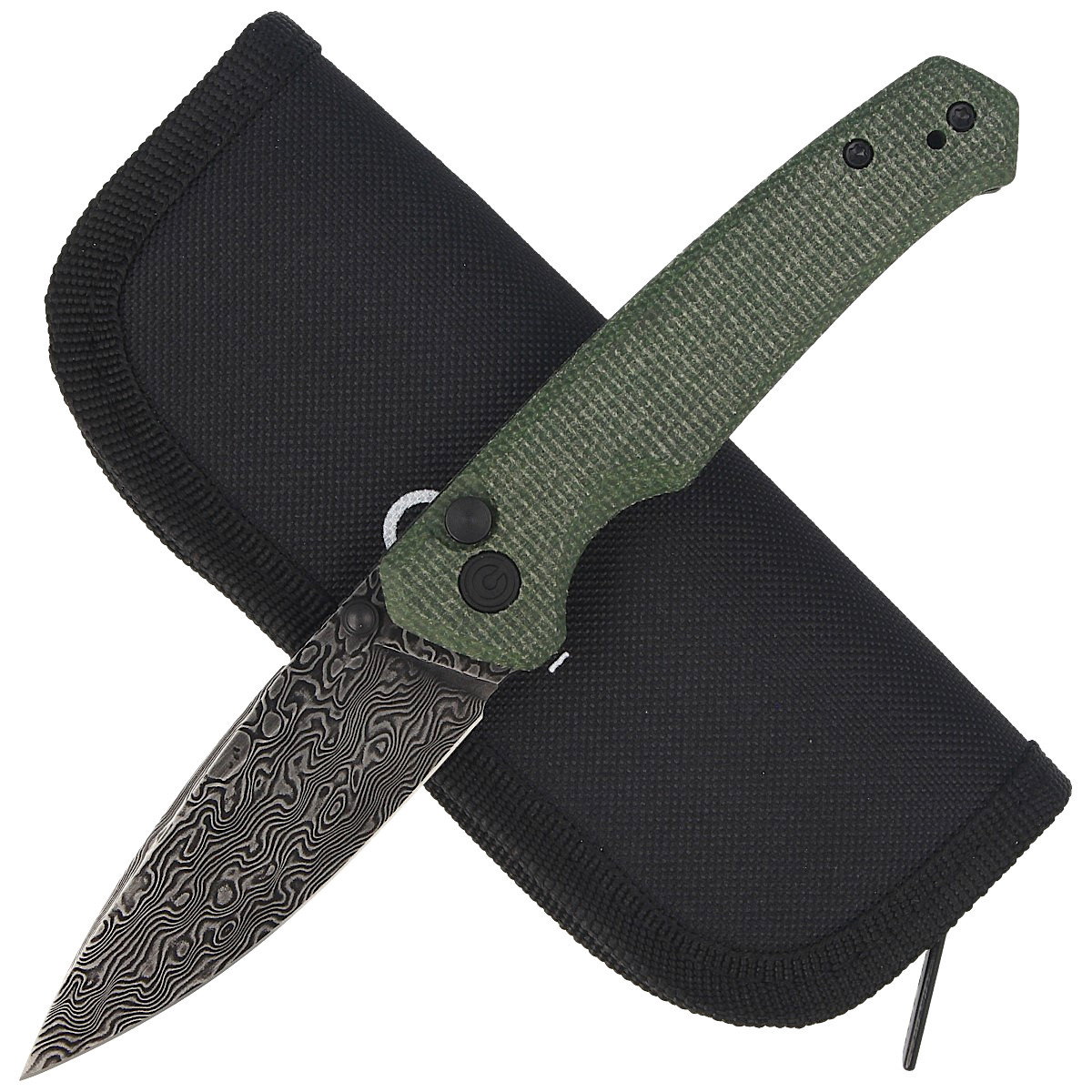 Altus Green G10, Black Damascus excellent E.D.C. knife with spear point head. Made of good materials at a very attractive price folder with a damascus blade, reversible clip and Button Lock with gravity opening of the blade. Bestseller!