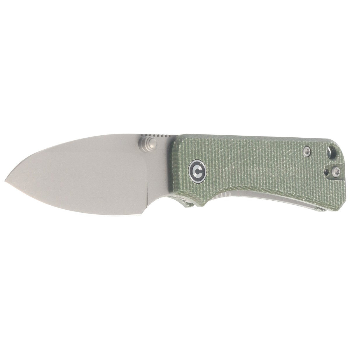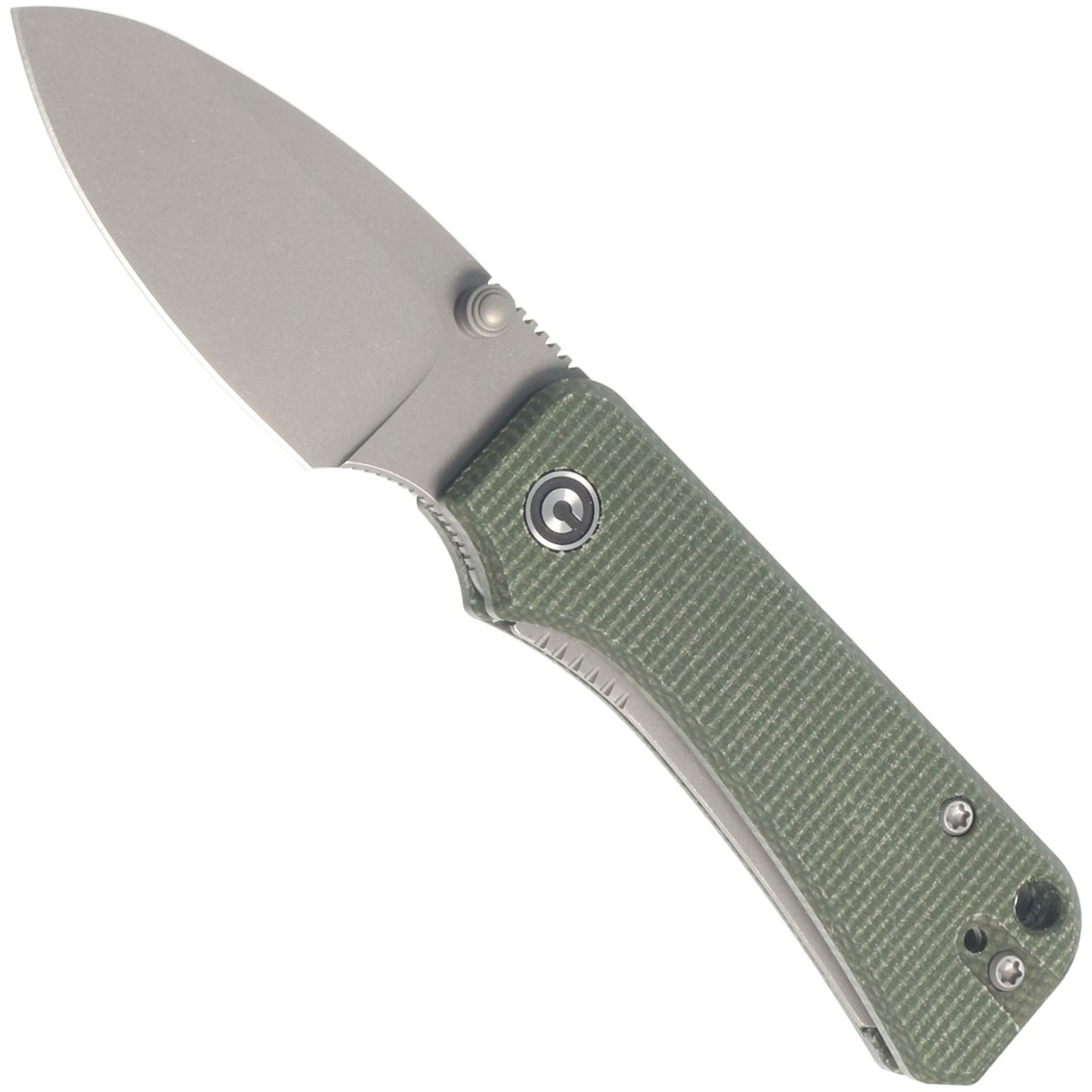 Handle - moled green pieces of Micarta plastic (pressure-pressed canvas with synthetic resin). Open-backed design - so called open-backed attached to each other with steel spacer sleeves - reduces weight and facilitates cleaning. The pivot axis is decorated with a stylized Civivi brand logo. A two-position left/right metal deep-carry clip allows you to carry the knife discreetly in your pocket in tip-up position (blade tip up). On the back of the handle lanyard hole, a hole for a cord.