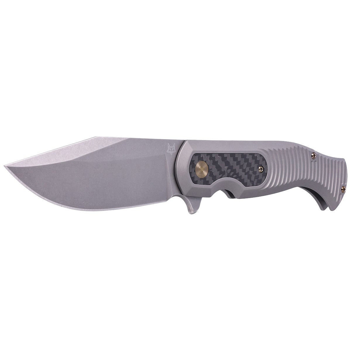 Handle - made of titanium, the beveled edges of the covers eliminate sharp edges, and the fore finger groove made on the front improves grip security. The facings are screwed to an intricately machined titanium backspacer, they give the assurance of many years of use. Upper jimping, a notched palm rest, was made along the entire length of the backspacer. Carbon Fiber insert in the front of the handle. A single-position (right) titanium deep-carry clip allows you to carry the knife discreetly in your pocket in tip-up position (blade tip up). Hidden lanyard hole in the back, a hole for threading a safety or decorative cord.