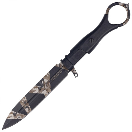 Handle - covered with FRN (Fiberglass Reinforced Nylon) plastic facings, fiberglass reinforced nylon. Finished with a large back ring / tail ring / pommel ring with a multifunctional skull crusher spike. Precisely contoured ring allows the use of martial arts techniques, can be used to strike specific points on the body, allows a solid grip preventing the knife from slipping when the going gets tough.