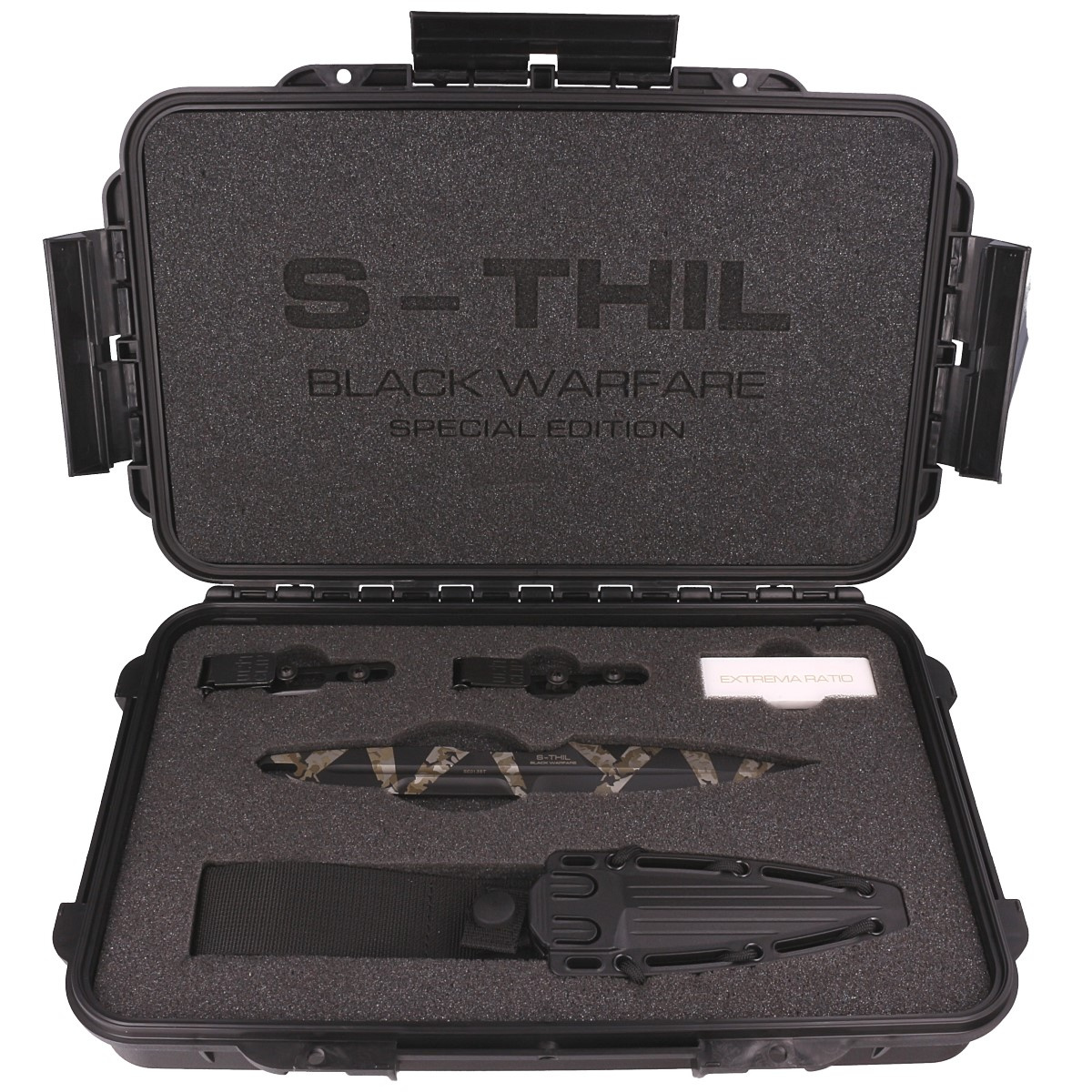 • S-THIL Black Warfare Special Edition. Spare tactical knife of monolithic construction, milled from 5mm bar of N690 steel. The Spear Point blade has been heat treated to 58 HRC for the best combination of edge retention and strength...