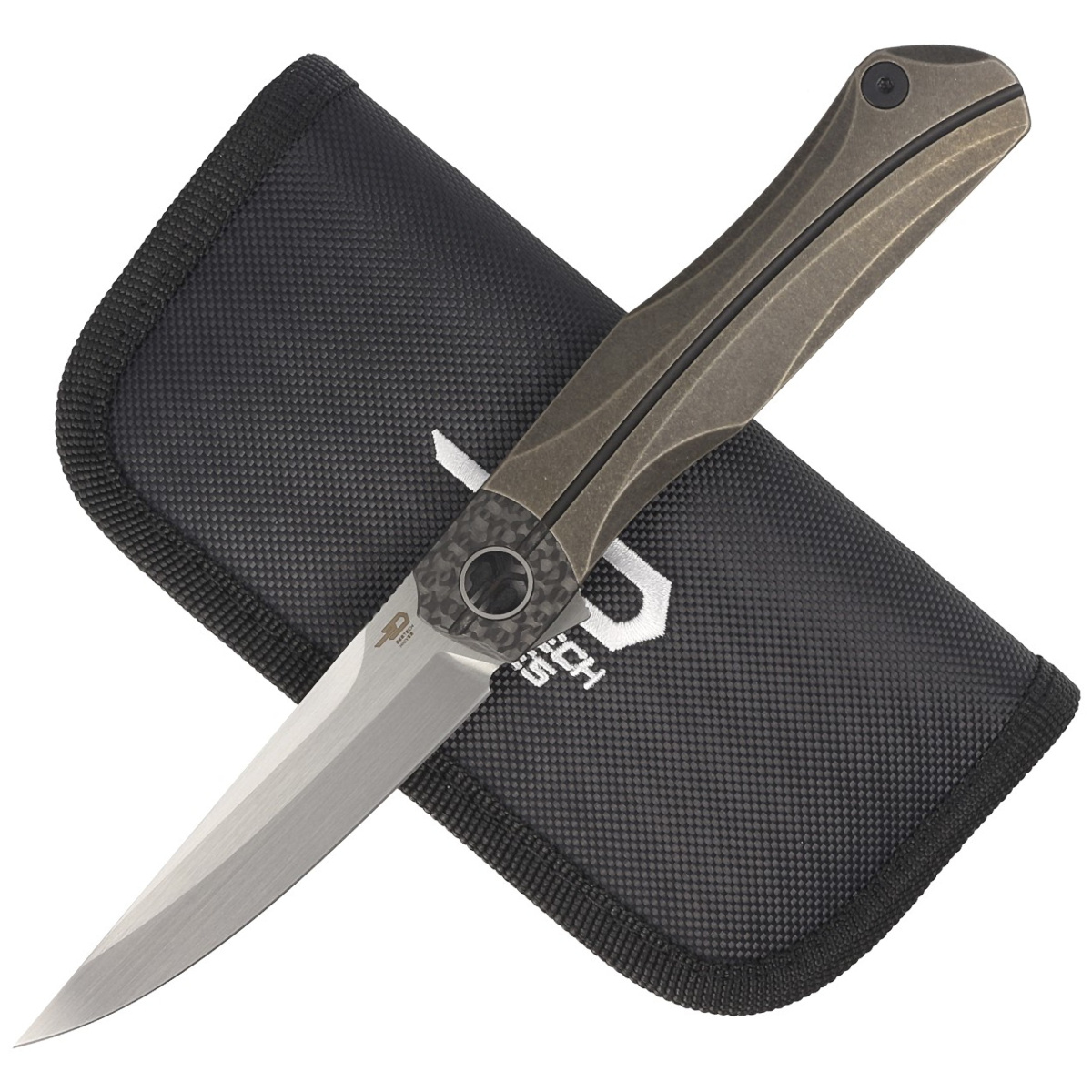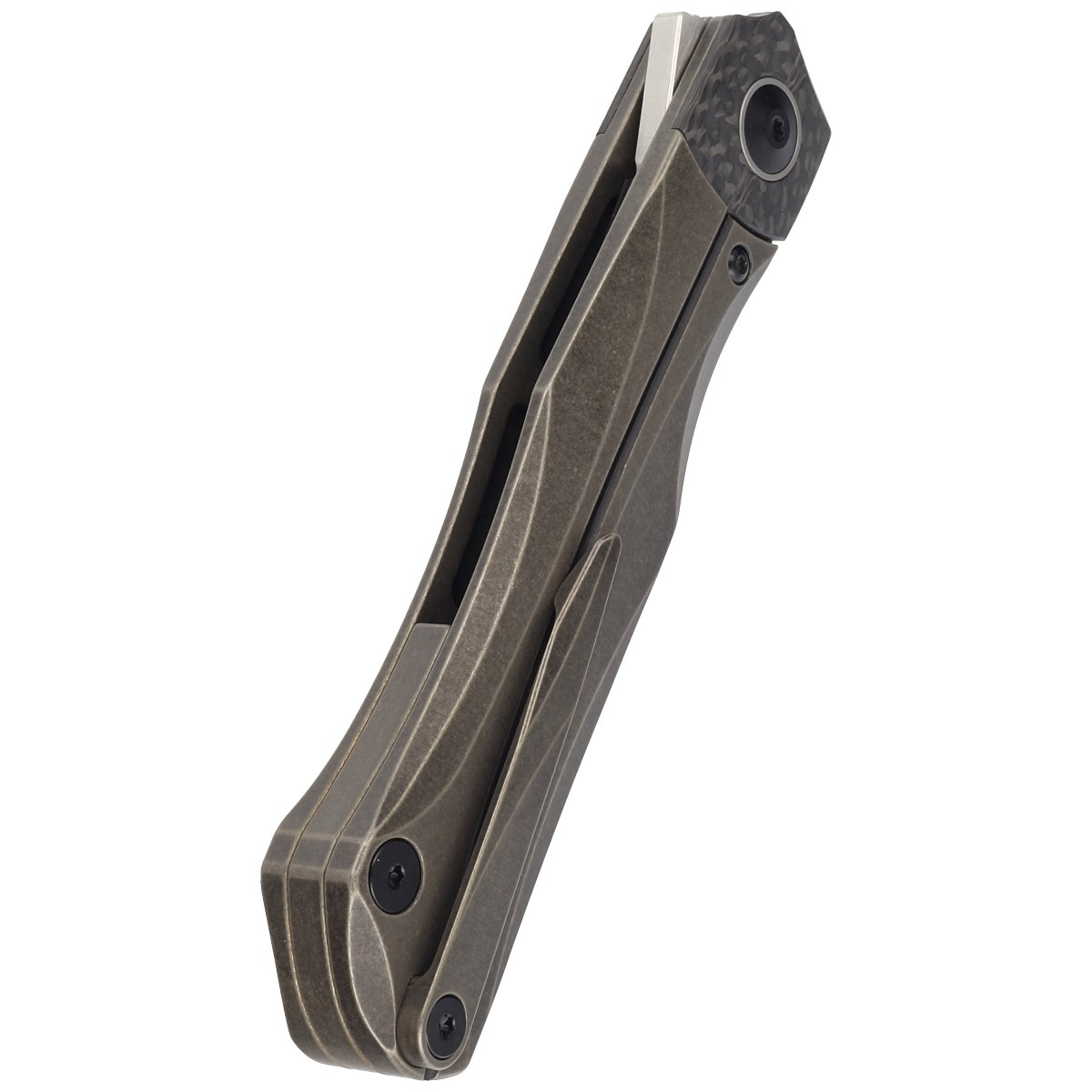 Thyra Bronze Stonewashed Titanium/Carbon Fiber, Horizontal Satin large and elegant EDC folder for discerning buyers, the result of cooperation between Polish designer Grzegorz "Kombou" Grabarski and Bestech Knives company. Artful handle, excellent blade steel!!!