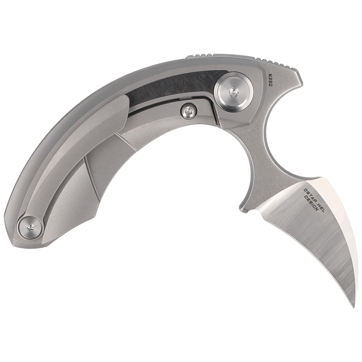 Handle - is two pieces of solid titanium 6AL4V with striking Marbled Carbon Fiber inserts. The chamfered edges of the covers eliminate sharp edges for comfort, and the fore finger groove improves grip security. Open-backed design attached with spacer sleeves reduces weight and facilitates cleaning. A single-position, right-handed titanium clip allows the knife to be carried in the tip-up position, with the tip of the blade upward.