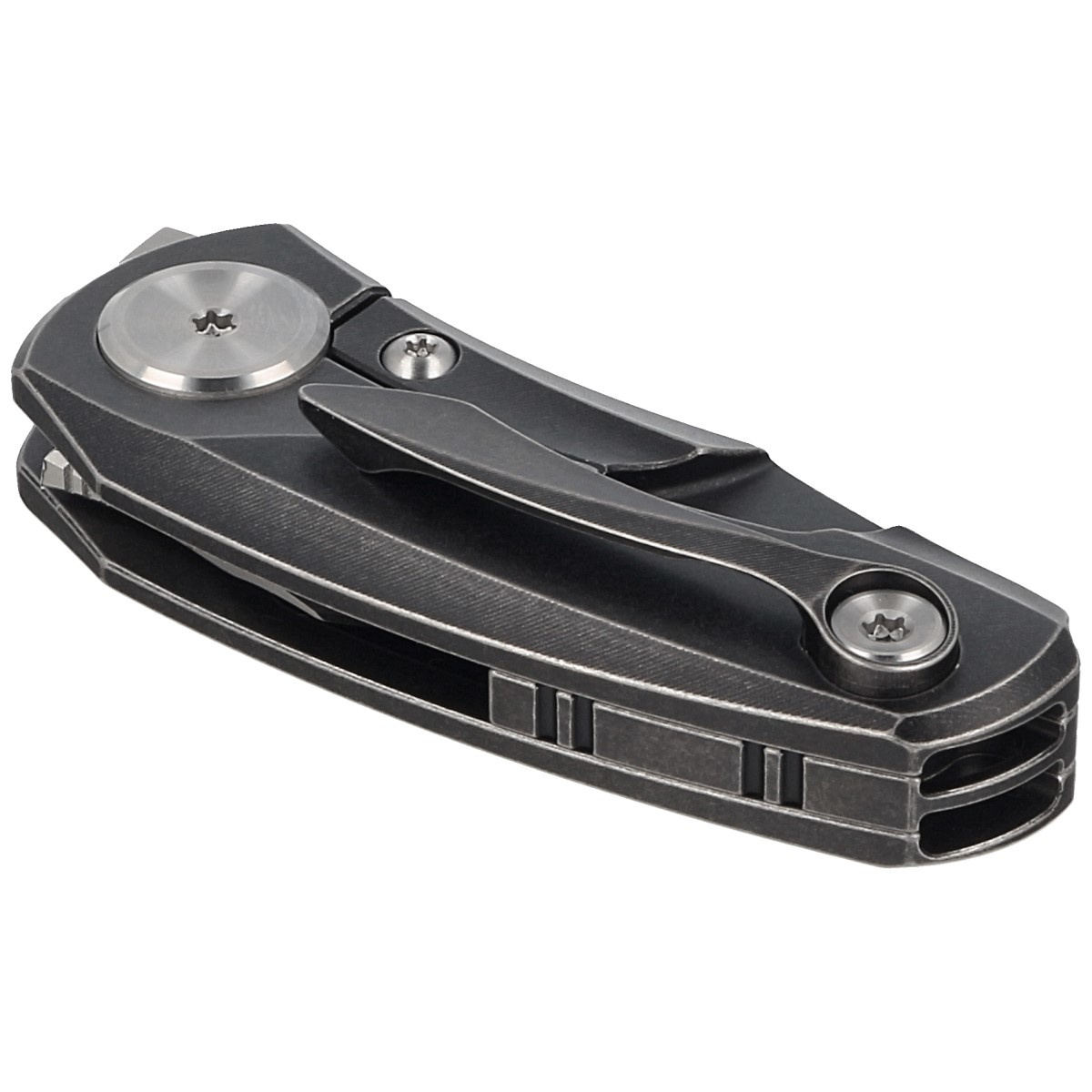 Handle - made of titanium 6AL4V, screwed to the backspacer, also made of titanium. Contouring of the cover eliminates sharp edges for a comfortable and secure grip. The simple, secure design gives assurance of years of use. A flat, low-profile, single-position (right) titanium clip allows the knife to be carried discreetly in the tip-up (tip up) position.