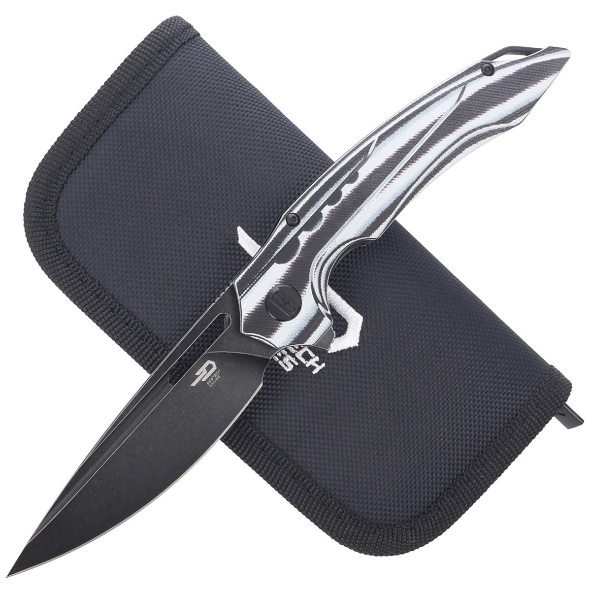 Handle - made of G10 composite (pressure-pressed fiberglass with synthetic resin) in two colors, beveled edges of the sheaths eliminate sharp edges Screwed to a solid steel backspacer, in its upper part a hole for a safety or decorative cord. The pivot is decorated with a stylized letter "B". A titanium, single-position, right-handed deep-carry clip allows you to carry the knife discreetly in your pocket in the tip-up (blade tip up) position. A fore finger groove improves grip security.