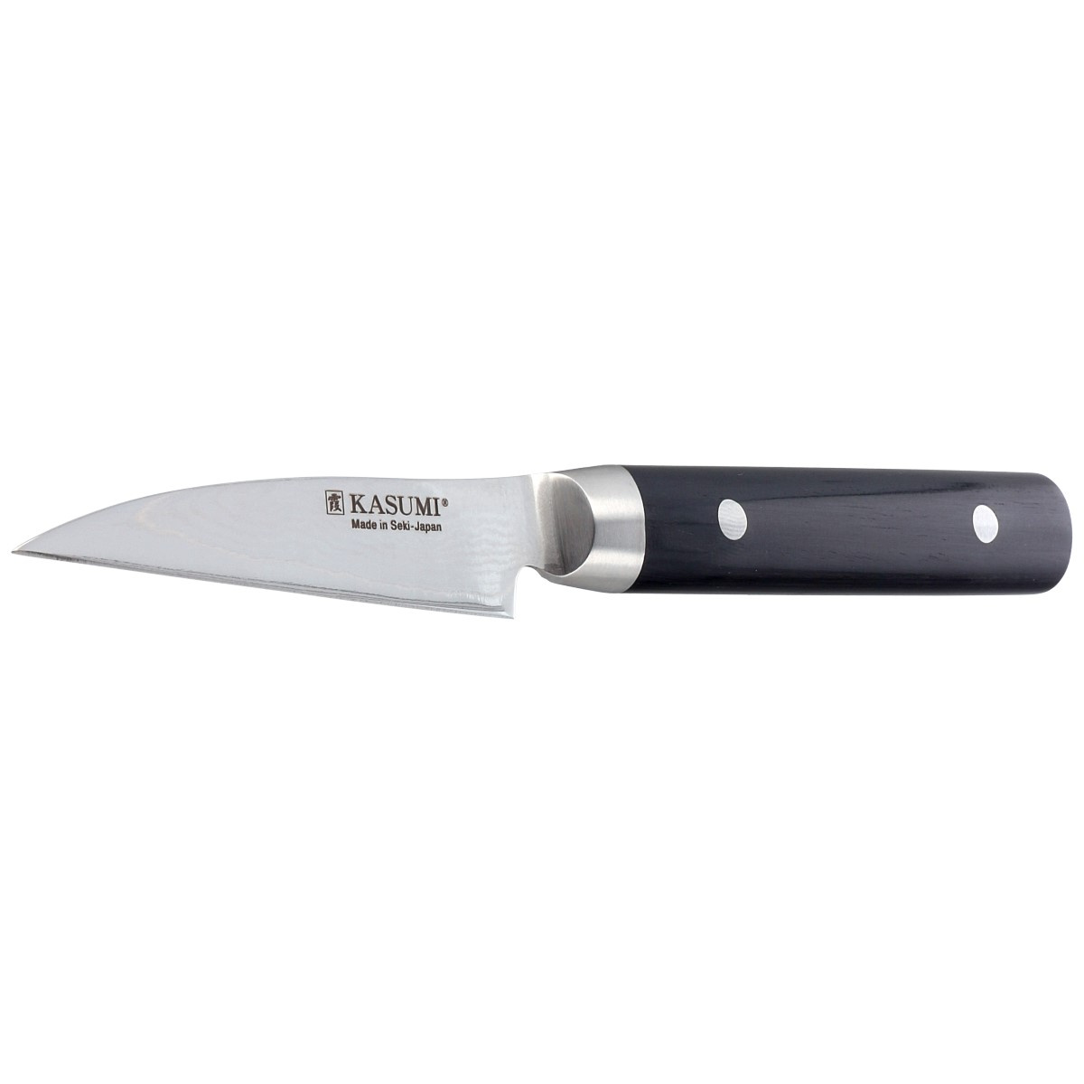 Kasumi Damascus Paring with VG-10 stainless steel core finished with 32 ply damascus. Made using the same methods as samurai swords, with a comfortable European pakka wood handle. Note!!! Very sharp!!! In 2002, "KASUMI" knives won the Design Plus Award at Ambiente Messe in Germany.