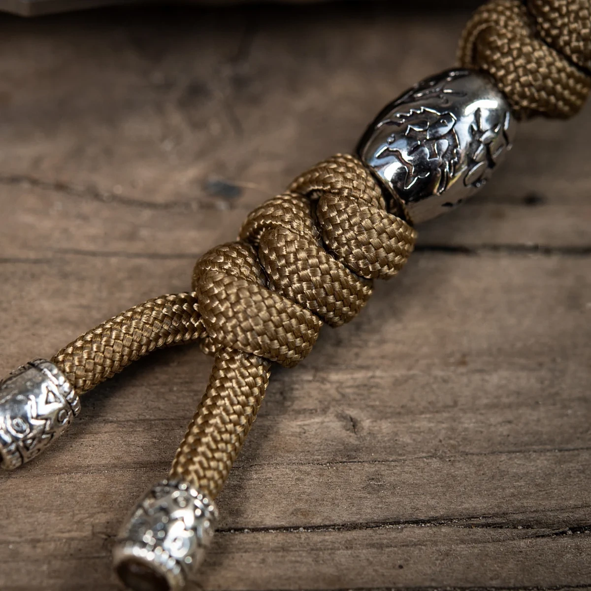 M-Tac Zeus Stainless Steel Coyote, a tag for knife, flashlight, keychain, made of paracord, finished with a metal bead with a Greek pattern. In addition to its aesthetic value, it extends the handle of the knife, making it easier to take it out of the pocket. It also excels as an extension of the zipper in a jacket, allowing comfortable use of the zipper even with thick gloves.