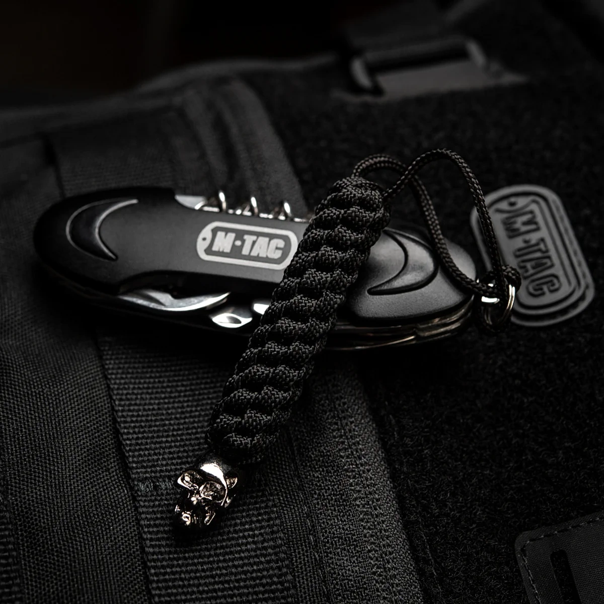 - M-Tac Cuboid Skull Black/Coyote, lanyard for knife, flashlight, keychain, made of paracord, ending with a metal skull. In addition to its aesthetic value, it extends the handle of the knife, making it easier to take it out of your pocket.