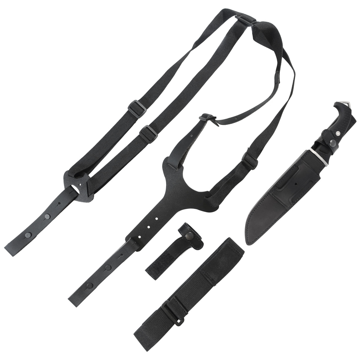 Sheath - when designing the knife for professional use, great emphasis was placed on ease of carrying and retrieval. The holster made of high-quality leather offers the possibility of attaching to the belt or, in the "tactical" version - to the thigh. In addition, it is possible to attach the sheath to a tactical harness system (included) for wearing under a jacket or blazer.