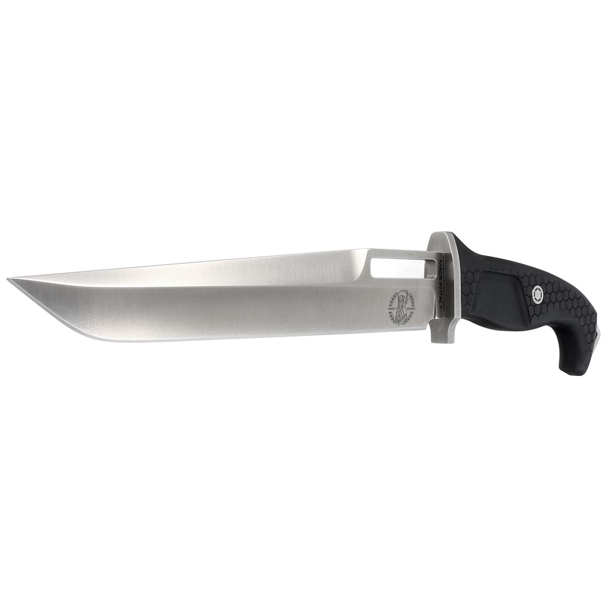 Handle - covered with Anticorodal Aluminum facings anodized black. Finished with a large multifunctional skull crusher spike. Twisted with decorative screws, they were covered with an intricate hexagonal pattern, which, in addition to aesthetic value, also improves the grip. In the front part, the company's trademark, finger recess. The strongly downward-curved shape of the handle with strong support for the back of the hand allows you to increase the efficiency and strength of your cuts without worrying about the knife falling out of your hand. The knife works perfectly in both saber and reverse grip.