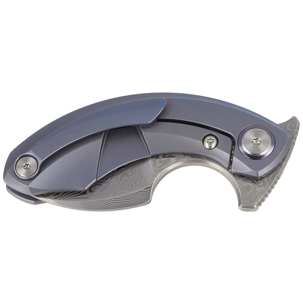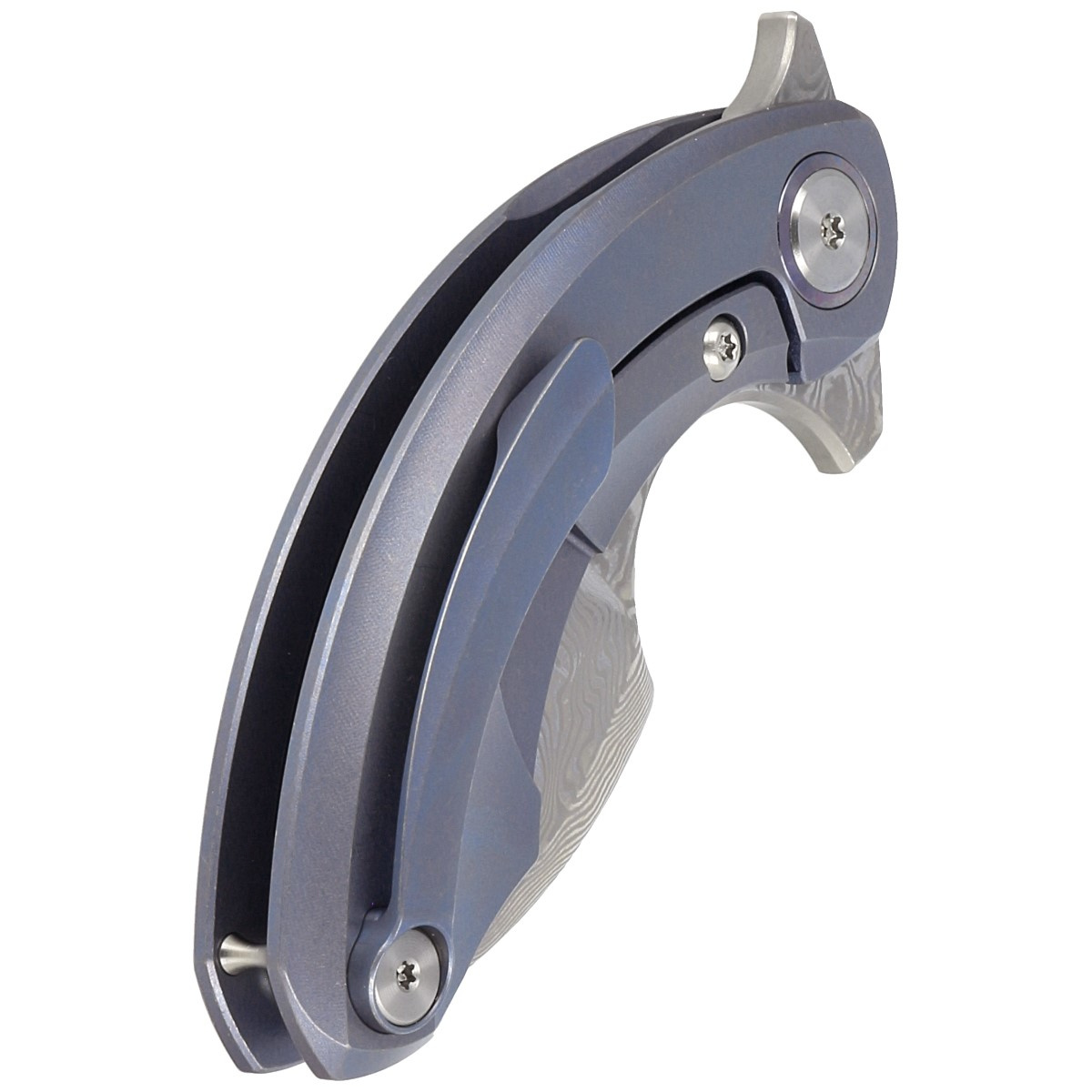 Handle - is two pieces of solid titanium 6AL4V with striking Marble Carbon Fiber inserts. The chamfered edges of the covers eliminate sharp edges for comfort, and the fore finger groove improves grip security. Open-backed design attached with spacer sleeves reduces weight and facilitates cleaning. A single-position, right-handed titanium clip allows the knife to be carried in the tip-up position, with the tip of the blade upward.
