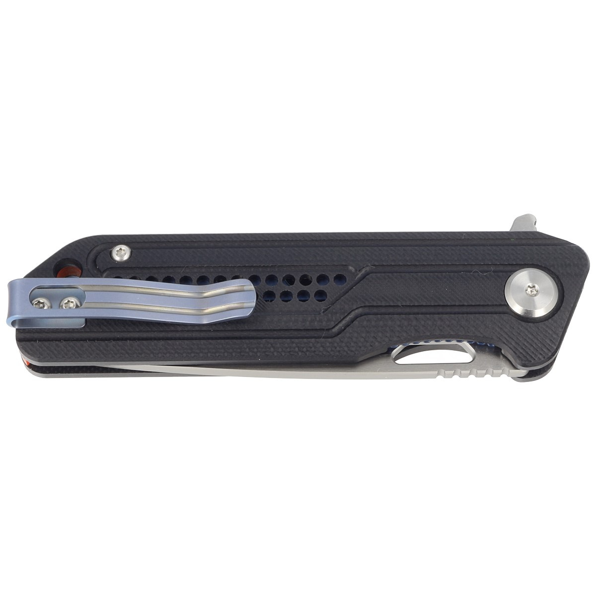 Handle - G10 liners, a plastic that is insensitive to weather conditions, resistant to chemicals and mechanical damage Chamfered edges of the covers eliminate sharp edges and textured surfaces improve grip security. A series of holes in the liner relieves stress on the knife. The solid backspacer to which the facings are attached guarantees the rigidity and strength of the entire structure. A single-position, right-handed titanium clip allows the knife to be carried in tip-up position, with the tip of the blade upward. Above the clip a hole for threading a safety or decorative cord.