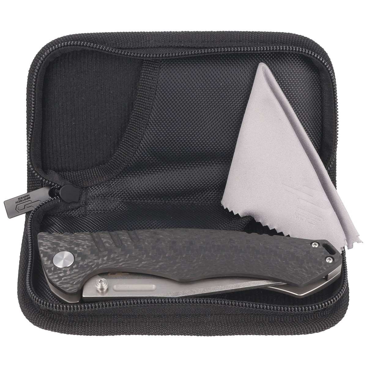 Handle - representative side made of Carbon Fiber, lock side made of solid 6AL4V titanium. Chamfered cover edges eliminate sharp edges for comfort and improve grip security. The solid titanium backspacer to which the facings are attached guarantees the rigidity and strength of the entire structure. A section of the back of the handle is covered with an upper jimping, notched thumb rest for easy control of the knife. A single-position, right-handed titanium clip allows the knife to be carried in the tip-up position, with the tip of the blade upward.